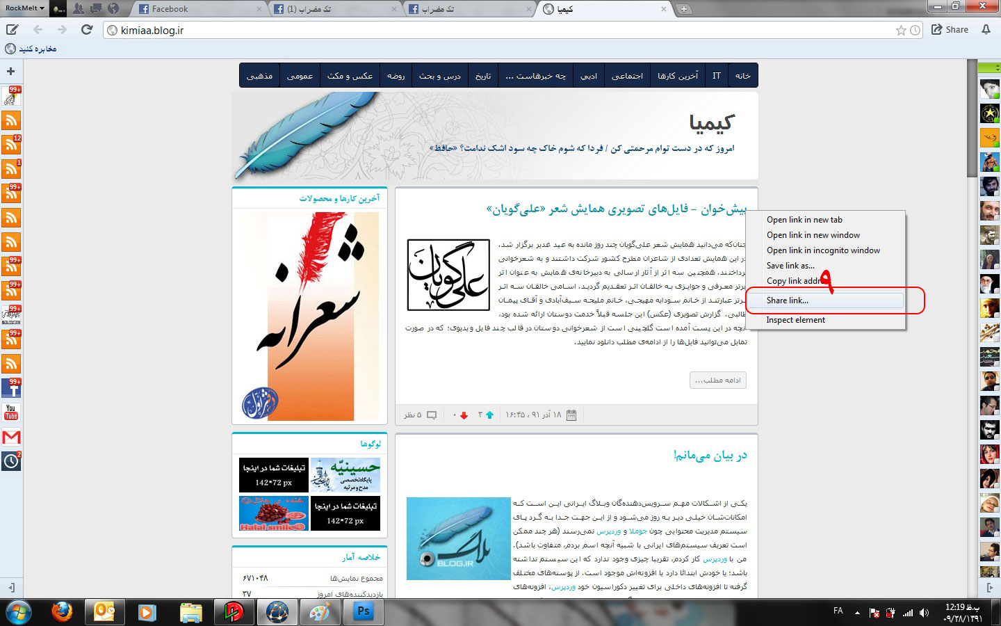 9- با کلیک راست بر روی لینکی که در صفحهی مرورگر خود دارید مثلا همین پست پیشخوان در وبلاگ کیمیا پنجرهای باز میشود که یکمی از امکاناتش، اشتراکگذاری لینک مورد نظر در فیسبوک است.