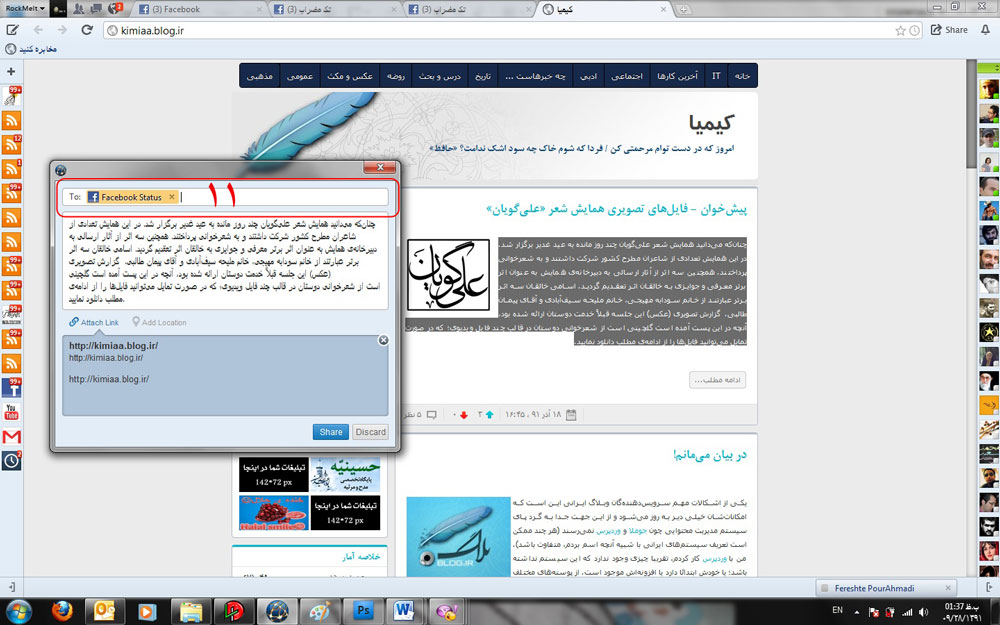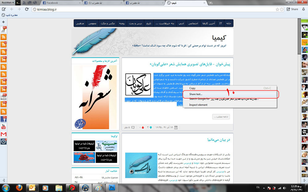 10- میتوانید یک متن را (مثلا یک بیت شعر برای اشتراکگذاری در تکمضراب یا یک قطعه متن ادبی یا متن یک خبر) را سلکت کنید و با کلیک راست از گزینهی اشتراگگذاری استفاده کنید و متن مورد نظر را به همراه لینک و عکسش به فیسبوک منتقل کنید.